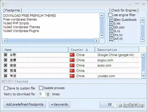 软件支持811个搜索引擎,也支持代理搜刮。