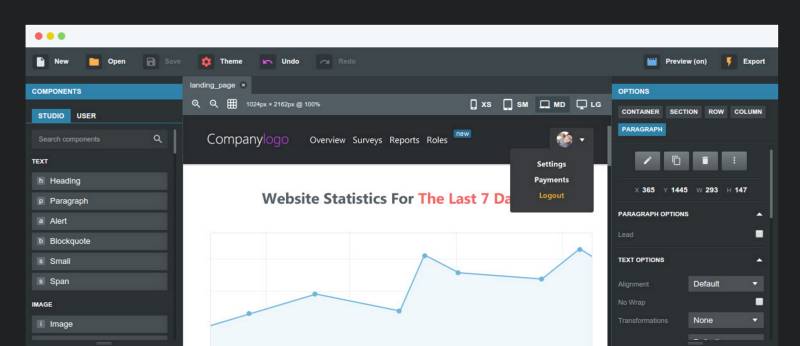 想用Bootstrap框架来创建响应式网站?那么就用Bootstrap Studio 来制作吧。这是一款面向设计师的桌面端软件,界面设计也秉承一贯的原则,干净直观,尽量为每一个用户提供足够爽快的体验。软件涵盖了丰富的组件,用户同样是通过托拽来搭建布局。开发团队承诺,软件所构建的页面本身的HTML和CSS代码和手写的代码一样清爽美观。