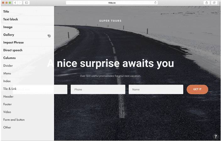 Tilda Publishing 同样是一个网站搭建平台,不过它更偏向内容型网站平台。170多款预制的设计模块,通过托拽完成布局,这样的设计还可以很好的保持响应式,确保你所设计 的网站能够在所有设备上正常打开和浏览。所以,如果你设计的是新闻、资讯、杂志等内容网站,这款工具几乎是为你而生的。