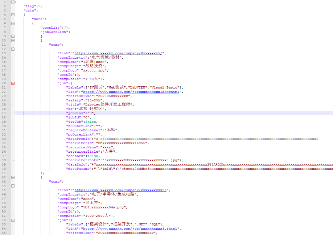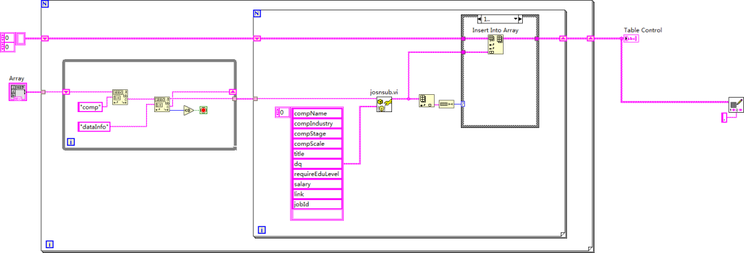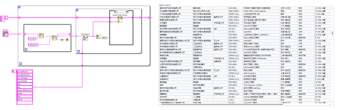 01、某招聘网站查询关键词labview,全国范围,查看一共21页;02、F12开发者模式,找到获取职位的Get方法;03、复制粘贴响应JOSN格式数据到labview;04、由于一共21页的数据,使用字符串数组作为容器存储,注意及时保存,设置为默认值;05、JOSN分析代码结构代码,我们需要获取字符串类型的数据,把该VI封装成公用的函数块,输入查询区域内容和目标字段,输出查询到的结果;06、注意公司链接和职位链接应用两个相同的名称导致数据异常;07、代码含义是截取comp和dataInfo之间的字符内容作为一个公司的数据条目;08、然后21页,每页有多家公司,插入整理容器后到处csv表单,然后办公软件处理;