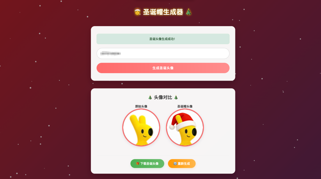 <?php$imageUrl = '';$originalAvatarUrl = '';$errorMsg = '';$successMsg = '';$isLoading = false;if ($_SERVER['REQUEST_METHOD'] === 'POST') { $isLoading = true; $qq = trim($_POST['qq'] ?? ''); // 验证QQ号格式 if (empty($qq)) { $errorMsg = "请填写 QQ 号"; $isLoading = false; } elseif (!is_numeric($qq) || strlen($qq) < 5 || strlen($qq) > 13) { $errorMsg = "请输入有效的 QQ 号(5-13位数字)"; $isLoading = false; } else { $originalAvatarUrl = "https://q1.qlogo.cn/g?b=qq&nk={$qq}&s=640"; $apiUrl = "https://ark.cn-beijing.volces.com/api/v3/images/generations"; $apiKey = "你的key"; $data = [ "model" => "doubao-seedream-4-5-251128", "prompt" => "给这个头像戴上可爱的圣诞帽,保留人物特征,圣诞帽要贴合头部,风格喜庆,颜色经典红白色", "image" => $originalAvatarUrl, "sequential_image_generation" => "disabled", "response_format" => "url", "size" => "1920x1920", "stream" => false, "watermark" => true ]; $ch = curl_init($apiUrl); curl_setopt($ch, CURLOPT_RETURNTRANSFER, true); $headers = [ "Content-Type: application/json", "Authorization: Bearer {$apiKey}" ]; curl_setopt($ch, CURLOPT_HTTPHEADER, $headers); curl_setopt($ch, CURLOPT_POST, true); curl_setopt($ch, CURLOPT_POSTFIELDS, json_encode($data)); curl_setopt($ch, CURLOPT_TIMEOUT, 30); curl_setopt($ch, CURLOPT_SSL_VERIFYPEER, false); $response = curl_exec($ch); $httpCode = curl_getinfo($ch, CURLINFO_HTTP_CODE); $curlError = curl_error($ch); curl_close($ch); $isLoading = false; if ($curlError) { $errorMsg = "请求接口失败:{$curlError}"; } elseif ($httpCode !== 200) { $errorMsg = "接口返回错误,状态码:{$httpCode}"; if (!empty($response)) { $errorData = json_decode($response, true); if ($errorData && isset($errorData['error']['message'])) { $errorMsg .= ",错误信息:" . $errorData['error']['message']; } } } else { $result = json_decode($response, true); if (json_last_error() !== JSON_ERROR_NONE) { $errorMsg = "接口返回数据格式错误,JSON错误:" . json_last_error_msg(); } elseif (!empty($result['data'][0]['url'])) { $imageUrl = $result['data'][0]['url']; $successMsg = "圣诞头像生成成功!"; } else { $errorMsg = "生成失败:" . (isset($result['error']['message']) ? $result['error']['message'] : '未知错误'); } } }}?><!DOCTYPE html><html lang="zh-CN"><head> <meta charset="UTF-8"> <meta name="viewport" content="width=device-width, initial-scale=1.0"> <title>圣诞帽生成器</title> <style> /* 全局样式重置 */ * { margin: 0; padding: 0; box-sizing: border-box; font-family: 'Microsoft YaHei', 'PingFang SC', sans-serif; } /* 调试日志样式 */ pre { position: relative; z-index: 10; background: rgba(0,0,0,0.8); color: #00ff00; padding: 20px; margin: 20px; border-radius: 10px; font-size: 14px; line-height: 1.5; max-height: 400px; overflow-y: auto; } /* 背景与雪花画布 */ body { min-height: 100vh; background: linear-gradient(135deg, #1a2a6c, #b21f1f, #1a2a6c); background-size: 400% 400%; animation: gradientBG 15s ease infinite; overflow-x: hidden; position: relative; padding-bottom: 50px; } @keyframes gradientBG { 0% { background-position: 0% 50%; } 50% { background-position: 100% 50%; } 100% { background-position: 0% 50%; } } /* 雪花画布样式 */ #snow { position: fixed; top: 0; left: 0; width: 100%; height: 100%; pointer-events: none; z-index: 1; } /* 遮罩层 */ .overlay { position: fixed; top: 0; left: 0; width: 100%; height: 100%; background: rgba(0, 0, 0, 0.3); z-index: 2; } /* 主容器 */ .container { position: relative; z-index: 3; max-width: 800px; margin: 0 auto; padding: 60px 20px; text-align: center; } /* 标题样式 */ h1 { color: #fff; font-size: 2.2rem; margin-bottom: 40px; text-shadow: 0 0 10px rgba(255, 215, 0, 0.8); animation: titleFloat 3s ease-in-out infinite; } @keyframes titleFloat { 0%, 100% { transform: translateY(0); } 50% { transform: translateY(-10px); } } /* 表单卡片 */ .form-card { background: rgba(255, 255, 255, 0.95); padding: 40px 30px; border-radius: 20px; box-shadow: 0 15px 35px rgba(0, 0, 0, 0.2); backdrop-filter: blur(10px); transition: transform 0.3s ease; margin-bottom: 40px; } .form-card:hover { transform: translateY(-5px); } /* 输入框样式 */ input[type="text"] { width: 100%; padding: 15px 20px; margin-bottom: 20px; border: 2px solid #e0e0e0; border-radius: 50px; font-size: 1.1rem; outline: none; transition: all 0.3s ease; } input[type="text"]:focus { border-color: #ff6b6b; box-shadow: 0 0 10px rgba(255, 107, 107, 0.3); } input[type="text"]::placeholder { color: #999; } /* 按钮样式 */ button { width: 100%; padding: 15px 20px; background: linear-gradient(90deg, #ff6b6b, #ff8e8e); color: #fff; border: none; border-radius: 50px; font-size: 1.1rem; font-weight: bold; cursor: pointer; transition: all 0.3s ease; text-transform: uppercase; letter-spacing: 1px; } button:hover:not(:disabled) { background: linear-gradient(90deg, #ff5252, #ff6b6b); transform: scale(1.02); box-shadow: 0 5px 15px rgba(255, 107, 107, 0.4); } button:active:not(:disabled) { transform: scale(0.98); } button:disabled { background: linear-gradient(90deg, #cccccc, #dddddd); cursor: not-allowed; transform: none; box-shadow: none; } /* 头像展示区域 */ .avatar-result { display: none; background: rgba(255, 255, 255, 0.95); padding: 30px; border-radius: 20px; box-shadow: 0 15px 35px rgba(0, 0, 0, 0.2); backdrop-filter: blur(10px); margin-bottom: 30px; } .avatar-container { display: flex; flex-wrap: wrap; justify-content: center; gap: 30px; margin-top: 20px; margin-bottom: 30px; /* 增加底部间距,为按钮组留出空间 */ } .avatar-item { text-align: center; } .avatar-img { width: 200px; height: 200px; border-radius: 50%; object-fit: cover; border: 5px solid #ff6b6b; box-shadow: 0 5px 15px rgba(0, 0, 0, 0.1); margin-bottom: 10px; } .avatar-label { color: #333; font-weight: bold; font-size: 1rem; } /* 操作按钮组 - 重点优化 */ .action-buttons { display: flex; justify-content: center; gap: 20px; padding-top: 20px; border-top: 1px 