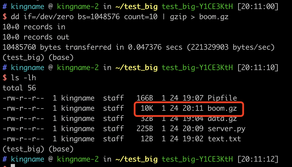 我现在把count改成10,给大家做一个演示(不敢用1GB的数据来做测试,害怕我的Jupyter崩溃)。生成的boom.gz文件只有10KB: