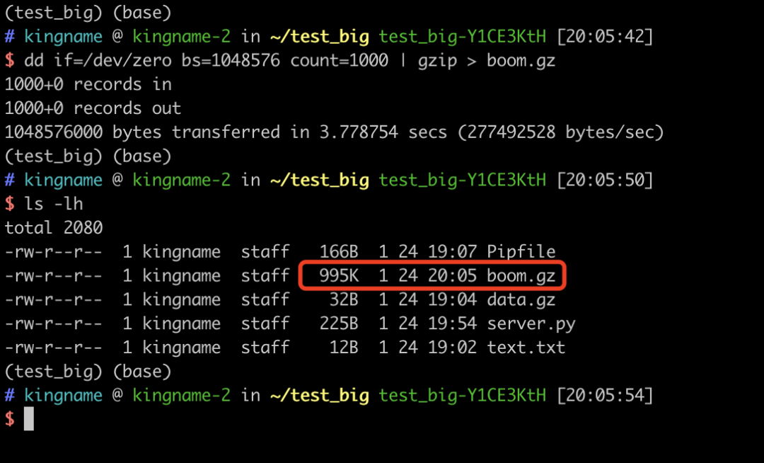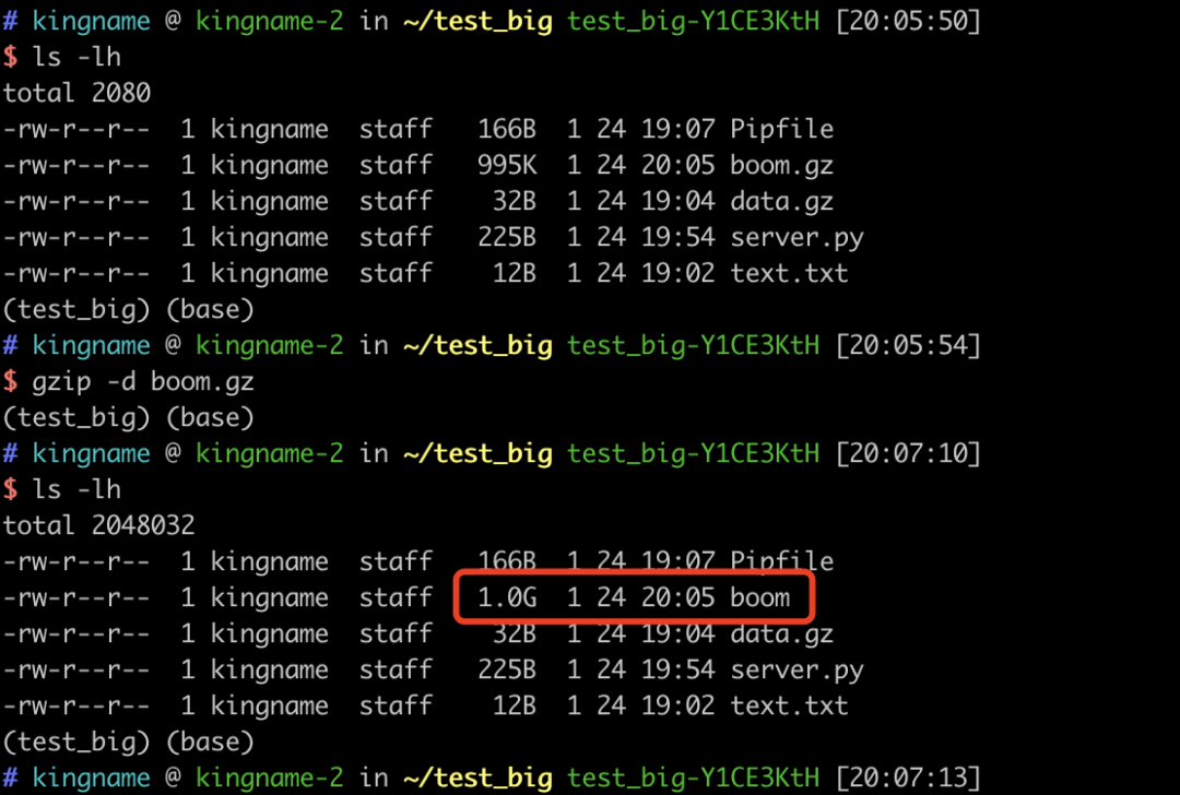 生成的这个boom.gz文件只有995KB。但是如果我们使用gzip -d boom.gz对这个文件解压缩,就会发现生成了一个1GB的boom文件,如下图所示: