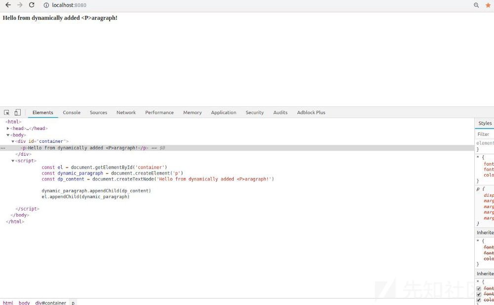 在这个非常简单的例子中,JavaScript添加一个元素到DOM树中。为了看清这样的不同,在开发者工具中使用Elements tab去查看