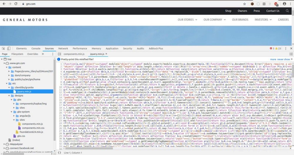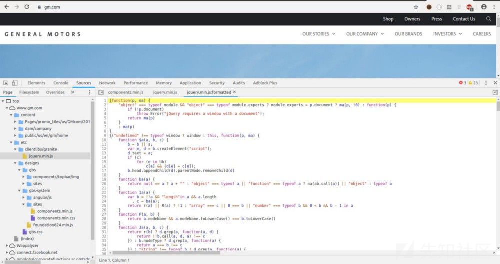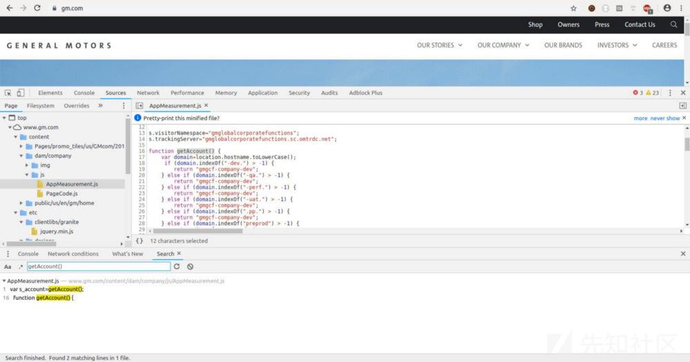 让我们用一个例子来快速的展示这个工具吧。首先,我需要一个JavaScript文件。我将检查来自GM.com 网站的AppMeasurement.js。然后我把这个文件从浏览器中复制下来(首先要解压,并格式化好),然后粘贴到代码编辑器中,然后后保存在一个临时文件夹中。