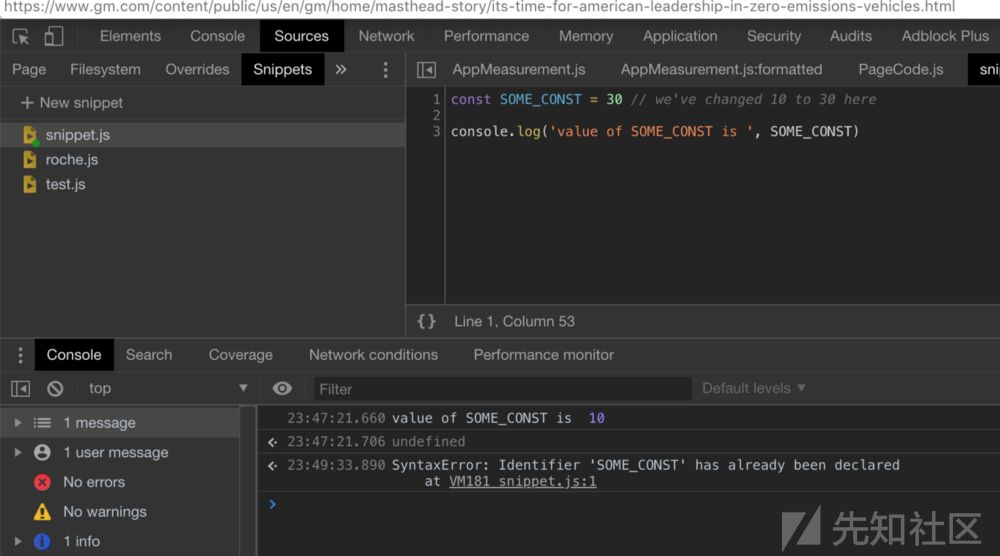 所以你如果用debugger停止正在运行的程序(所有通过程序代码定义的变量,类和函数将会存在于执行环境之中)。如果你试图使用现有的标志在同一个标签页中创建snippet--有时你要么会覆盖原来网页的代码,要么在 重新初始化某些变量时会让页面报错(比如常量)。