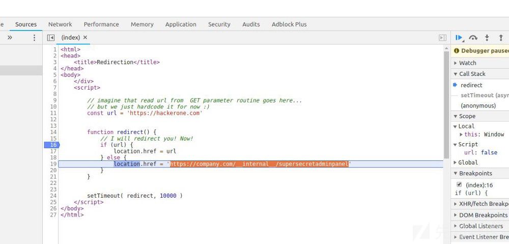 现在你需要花费一些时间去阅读和理解这些代码。如你所知,如果16行的那个条件语句为TRUE的时候,我们将会跳转到HackerOne那个网站