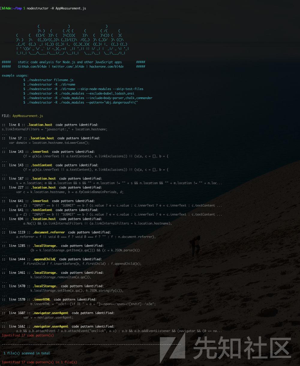 在终端中,我在AppMeasurement.js文件上运行nodestructor(-H参数是让这个工具去搜索各种HTML5的APIs)