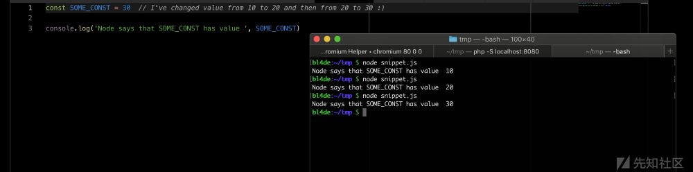如你所见,代码片段按照预期的行为去工作,但是你如果试图改变SOME_CONST的值,再次运行snippet,你会收到下面的这个语法错误: