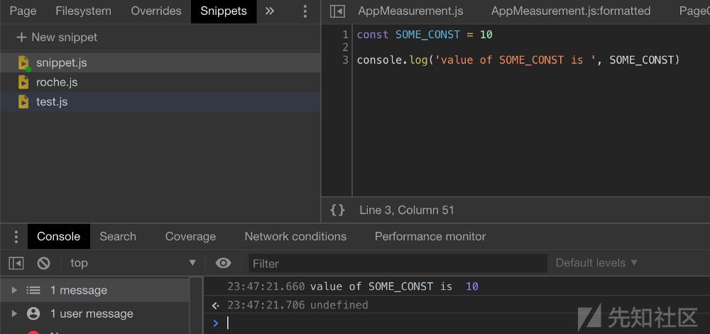为了避免上面的问题,不要使用Snippets(还有有一种比较好的办法,就是你新开一个浏览器标签页,然后打开开发者工具并在那里创建一个新的snippet),你可以使用NodeJS来运行你的JavaScript代码