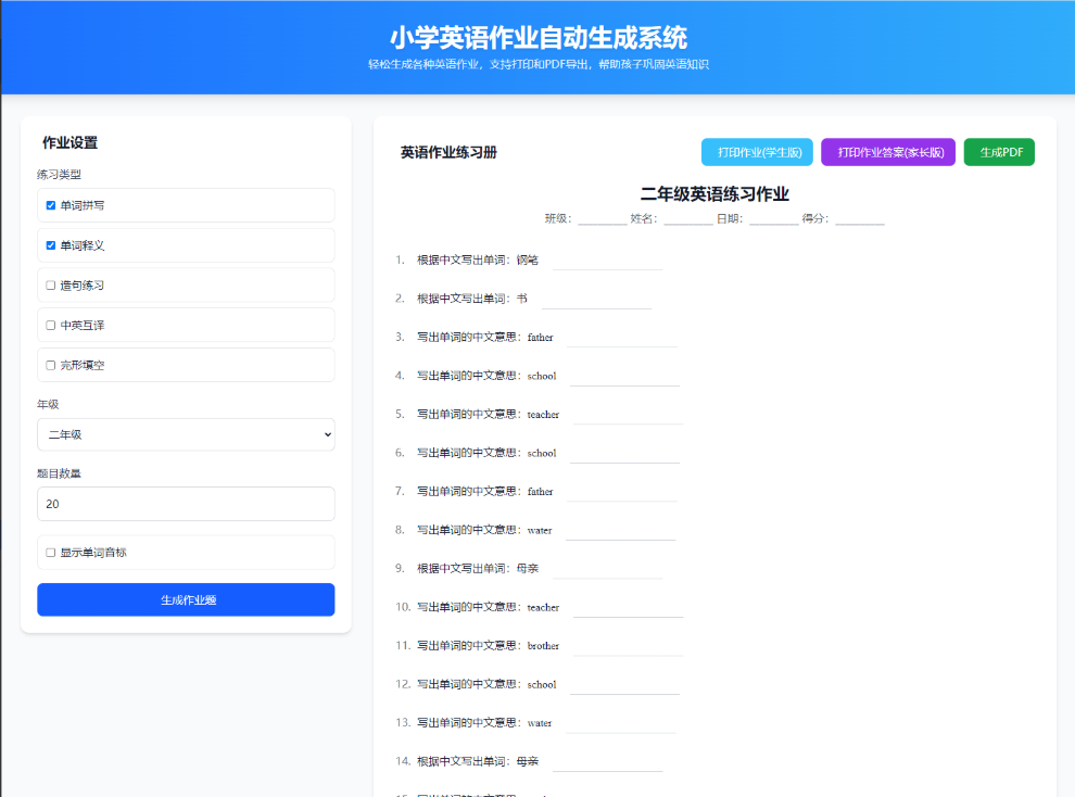 这款专注于小学英语作业的出题网站,界面简洁易用,支持随机生成多种英语练习题目,包含单词、句型等练习类型,并支持打印功能,底部已添加指定的版权信息和防篡改措施。