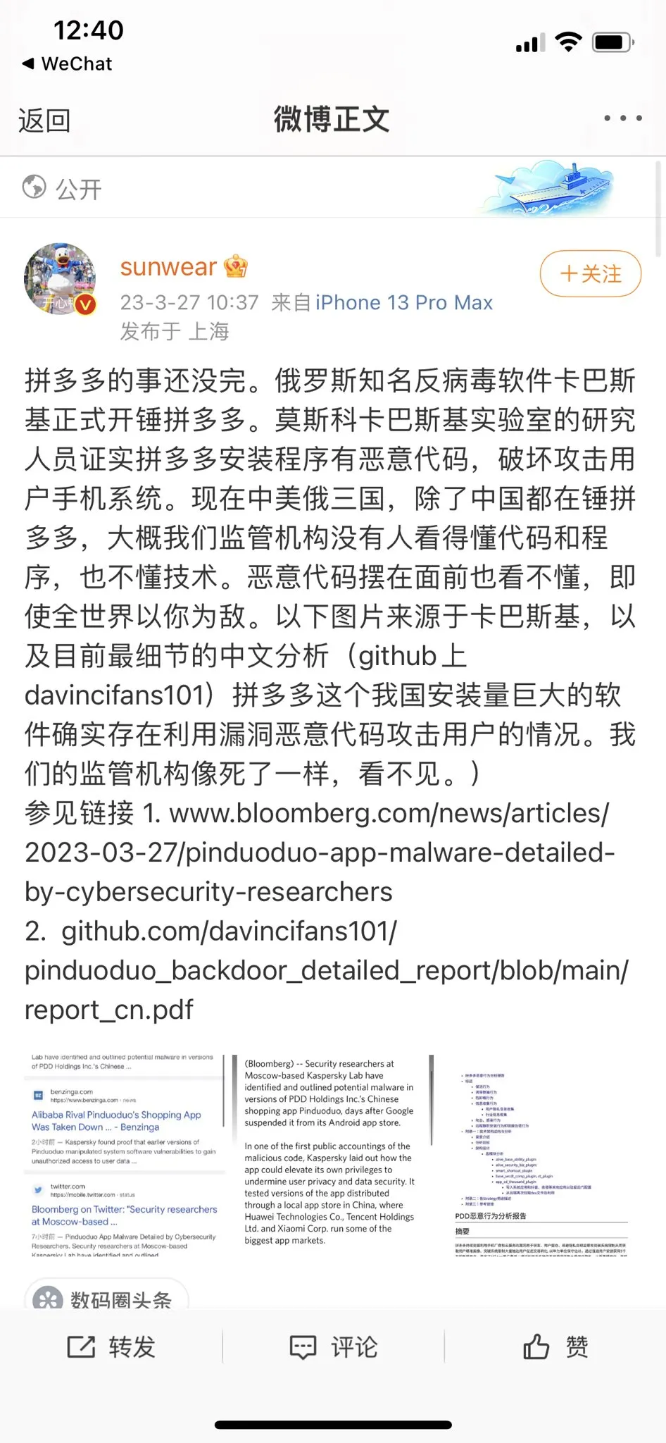 在对恶意代码的首批公开报告之一中,卡巴斯基阐述了该应用程序如何提升自身权限以破坏用户隐私和数据安全。它测试了通过中国本地应用商店分发的应用版本 —— 包含来自华为、腾讯和小米的应用市场。卡巴斯基与彭博社分享的调查结果是独立安全团队对上周触发谷歌行动和恶意软件警告的最清晰解释之一。这家网络安全公司在揭露历史上一些最大的网络攻击方面发挥了作用,该公司表示,它发现了早期版本的拼多多利用系统软件漏洞安装后门并获得对用户数据和通知的未授权访问的证据。这些结论在很大程度上与过去几周其他研究人员在网上发布的结论一致,尽管彭博新闻社尚未证实早期报道的真实性。网络安全专家 @sunwear 也发表了对此事的看法:除了卡巴斯基实验室,另外一家安全公司 Lookout 的研究人员对非 Google Play 版本的拼多多应用的分析也确认了独立安全研究机构 DarkNavy 的指控。初步分析显示,至少两个非 Play 版本的拼多多应用利用了漏洞 CVE-2023-20963。该漏洞是 Google 在 3 月 6 日公开的,利用该漏洞可以提权,而且整个过程不需要用户交互。两周前修复补丁才提供给终端用户。Lookout 的研究人员分析了拼多多在 3 月 5 日前发布的两个版本,都包含了利用 CVE-2023-20963 的代码。这两个版本都使用了与拼多多 Google Play 版本相同的密钥签名。目前没有证据表明 Play Store 和苹果 App Store 的版本含有恶意代码,但通过第三方市场下载的 Android 用户则没有那么幸运了,鉴于拼多多有数亿用户,受影响的用户数量可能是非常惊人。 本文转载自:「OSC开源社区」,原文:https://tinyurl.com/2eeem65h,版权归原作者所有。欢迎投稿,投稿邮箱: editor@hi-linux.com。