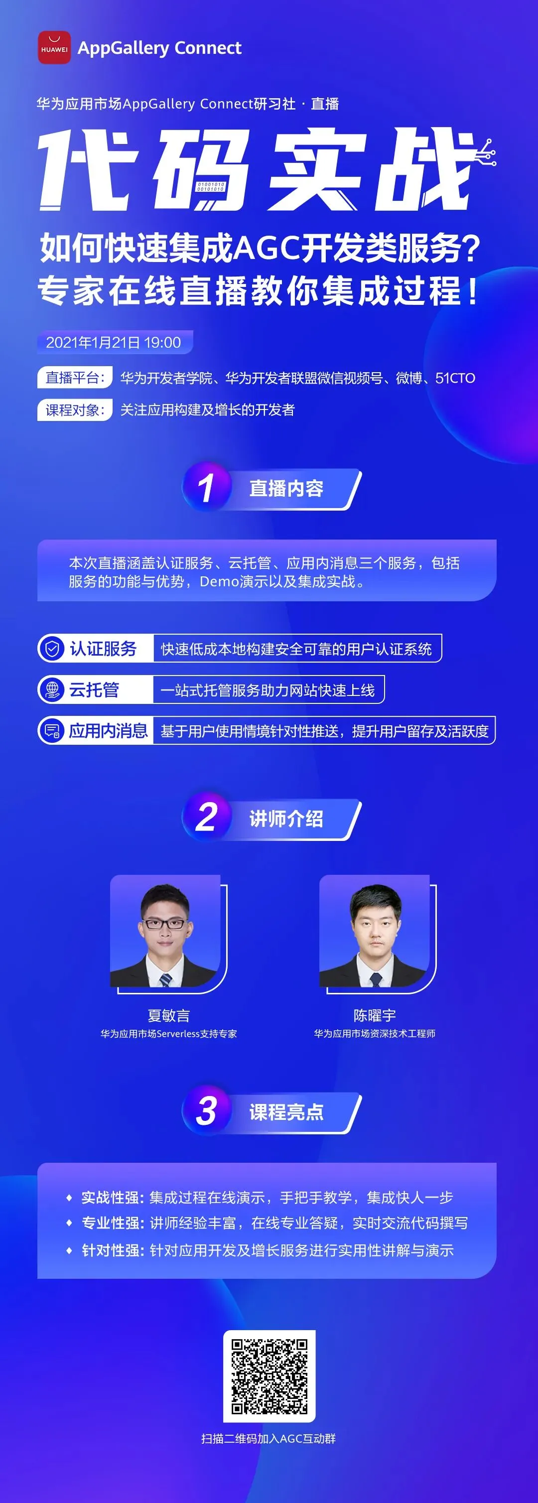 1月21日19点,华为应用市场AppGallery Connect专家团队将在线为大家带来丰富干货解读:涵盖认证服务、云托管、应用内消息三个单服务,帮助开发者更好地集成AppGallery Connect开发类服务,提高开发效率。
