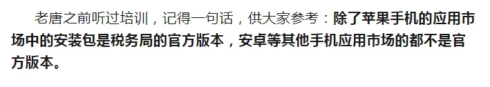 因为如果这两项选错了,还可能安装的是非官方版本,还可能出现问题。最后,我再重复一次之前的话:除了苹果手机的应用市场中的安装包是税务局的官方版本,安卓等其他手机应用市场的都不是官方版本。