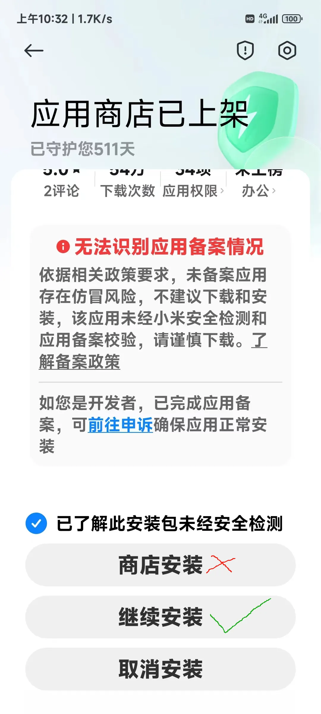 安装时候也要擦亮慧眼,手机系统提示时候不要选择应用商店安装,选择下图中的“继续安装”