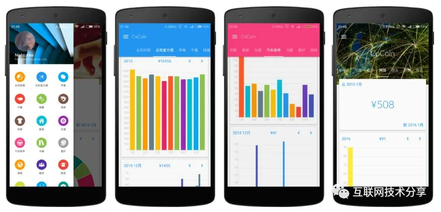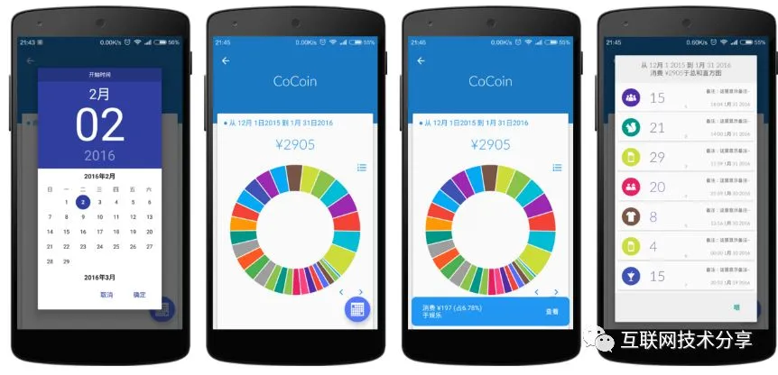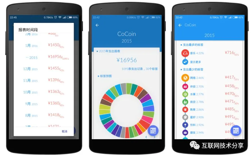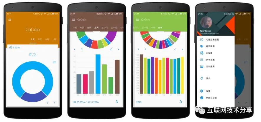 在账本中,有对今天、昨天、这周、上周、这个月、上个月、今年和去年的记录。您可以通过点击饼状图的饼块或者柱状图的柱形来查看详细支出信息。CoCoin的所有图表都可以通过点击来获取详细信息,您也可以通过点击图表旁的选择按钮来对某些不易点击得到的地方进行查阅。点击或选择图表中的某一部分会有弹窗提示相关信息,点击查看可以在弹出的对话框中看到列表,列表中即为每条记录的信息。通过点击列表中的某一条记录,您可以看到更为详细的情况。如果您希望通过更多的视图来查阅自己的支出情况,右滑打开菜单即可。