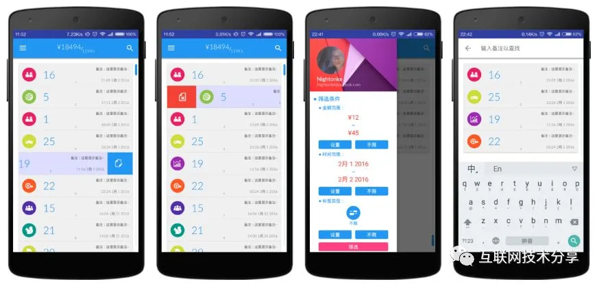 在列表视图中,您可以进行筛选、查询、更改、删除记录的操作。左滑某一记录进行编辑,右滑进行删除。右滑打开菜单,您可以设置支出范围、时间范围、标签来筛选特定的支出记录。点击右上角的搜索按钮,可以通过备注来搜索特定的记录。