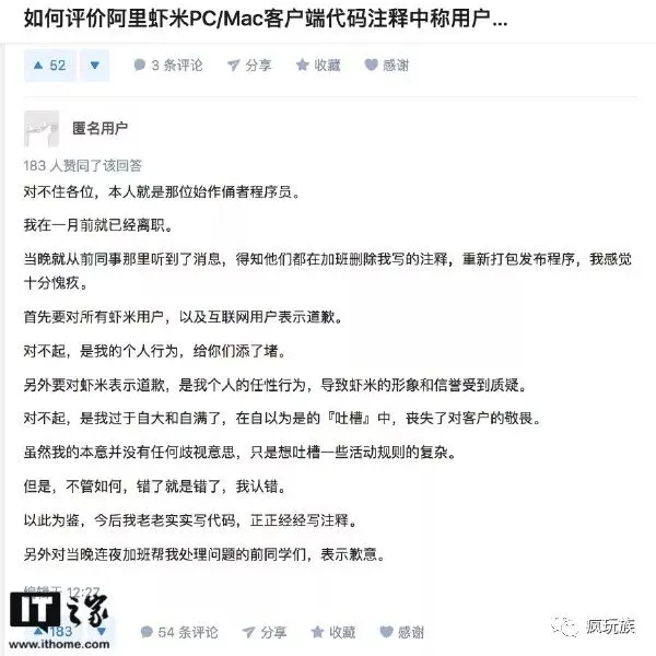 今天,虾米音乐App前员工八座在知乎(已匿)更新评论,“今后我老老实实写代码,正正经经写注释”。他说,在自以为是的“吐槽”中丧失了对客户的敬畏,对所有虾米用户,以及互联网用户表示道歉。