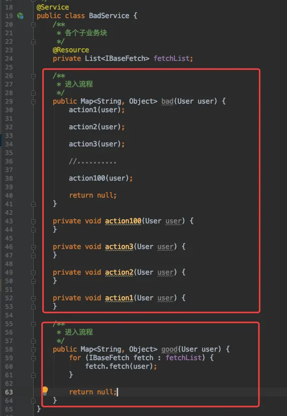 这个其实在上面已经讲了,是类似的做法。将一大堆在同一个大方法里的小方法全部变成某个接口的实现类,从而将方法的顺序执行,变成对接口集合的遍历执行。后续增加或删减方法时,只操作对应的类即可,而不需要对这个大流程做修改。