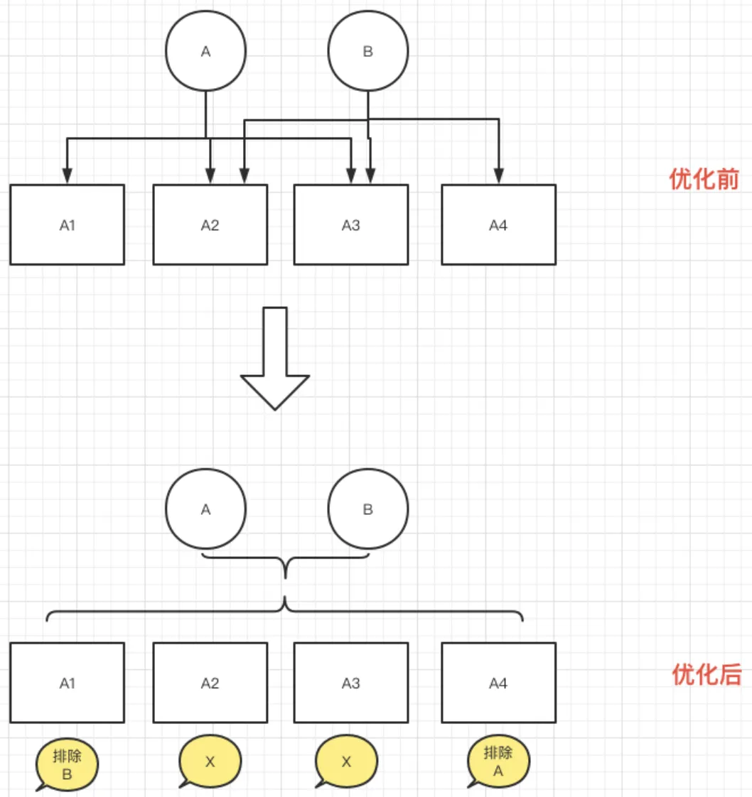 我们主要优化的点就是将这个逻辑给去掉,让主逻辑器职责单一,每个业务单元也职责单一。将上面的逻辑变成如果是A1,则来源是A时我工作,是B时我不工作,如果是A2,则来源A、B我都工作,如果是A4,则来源A我不工作,来源B我工作。