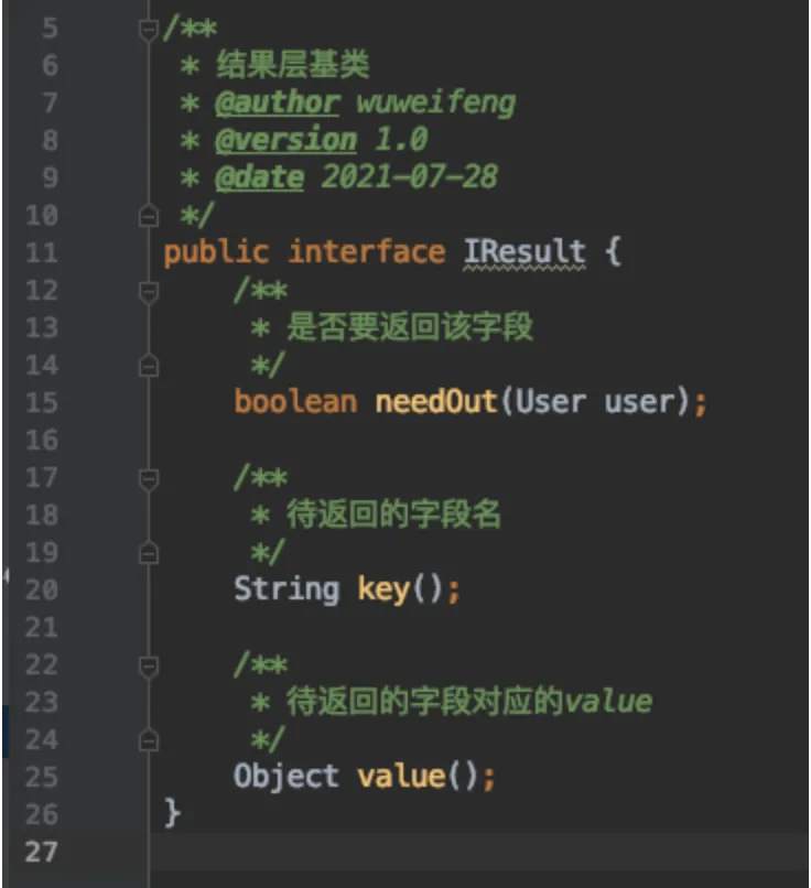 定义一个接口如下,定义boolean型方法,让各字段决定自己要不要返回。定义key、value,用来存放字段名和value。