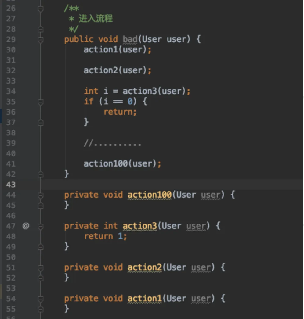 长逻辑这种最常见,也是最好处理的。我们经常在写一处逻辑时,刚开始很简单,几行就解决了,后来随着业务越来越膨胀,这个方法也是越来越长。终于有一天,代码长到显示器装不下它了,后面的逻辑开始出现对前面的逻辑产生影响了,这个方法就开始变的有"坏味道"。