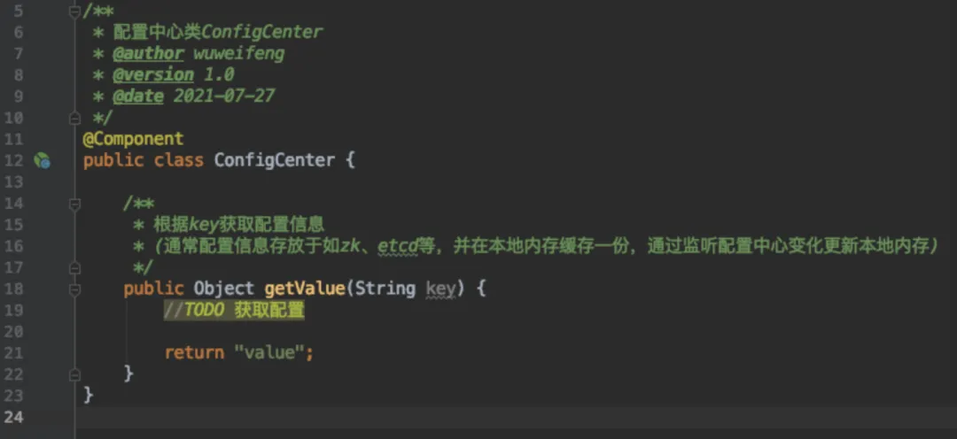 那么ConfigCenter就是配置中心工具类,里面提供了根据key获取value的方法。配置中心大抵如注释所描述的,在应用启动时,全量从zk、etcd等拉取配置并保存在本地内存,并开启监听,当配置中心内容有变化时,更新到本地内存里。