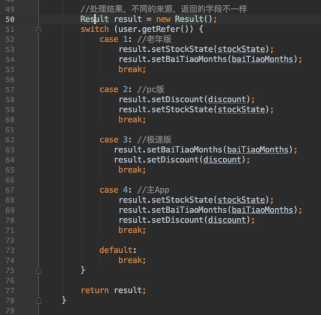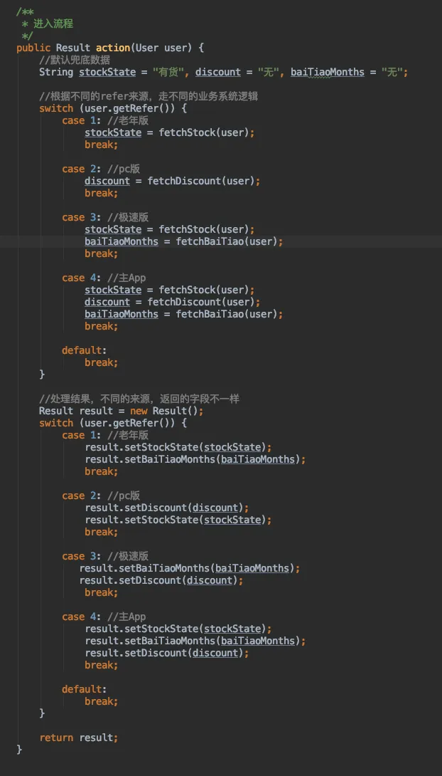 在重构前,代码进入主流程后,如下图,就是简单地根据refer来决定是否走哪些模块、返回哪些参数。