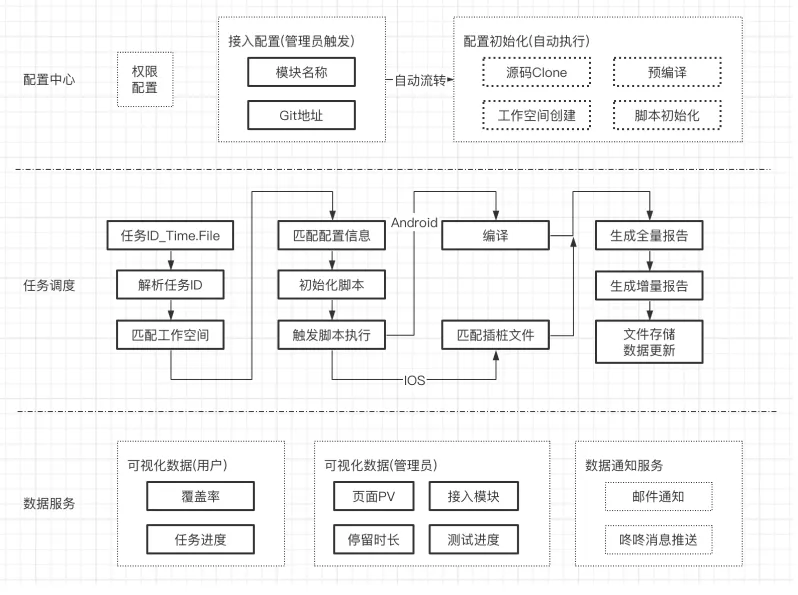 数据服务部分:数据服务,主要对每一个任务ID关联的模块信息、版本信息、代码分支信息、及覆盖率信息进行存储及展示,针对管理员用户,还提供了页面访问PV,停留时长、接入模块统计以及测试人员纬度的测试进度等数据展示。整个数据服务部分,将代码测试情况、模块接入情况及测试人员测试进度情况数字化的呈现给团队,并可以通过邮件推送、咚咚消息推送等渠道,周知给团队内每一个人。