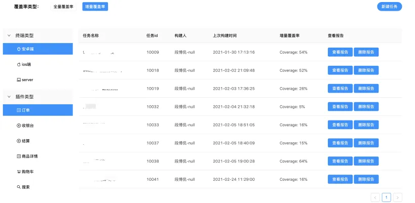 通过上述SDK接入,测试人员在客户端同步任务ID后,可以开始进行正常的回归测试或者是功能测试。SDK会依据预先配置的策略进行插桩执行信息统计,写入文件中,完成上传。服务端任务执行完毕后,可以在VPM平台,进行增量、全量报告的查看。