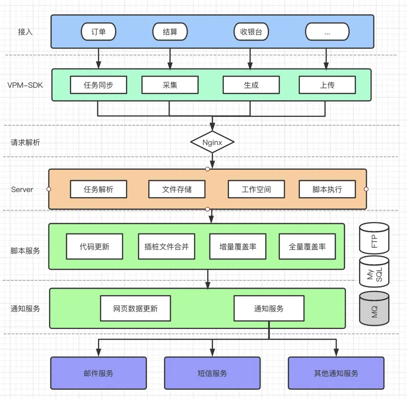 依下图所述,覆盖率扫描平台整体包含覆盖率接入收集SDK、覆盖率统计分析引擎、覆盖率辅助提升系统、覆盖率可视化管理平台、自动化报告推送系统等5部分。