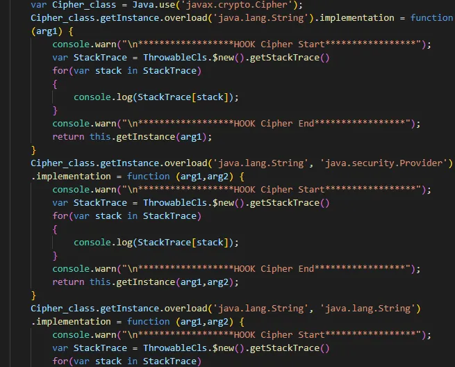 我们知道,javax.crypto.Cipher为开发者在加密时候常用的一个库,在开发中调用这个库,库中的方法到最后都会去调用一下getInstance这个方法,所以我们要做的就是打印getInstance这个方法的所有ovaload的堆栈,这里打印getInstance的重载方法。