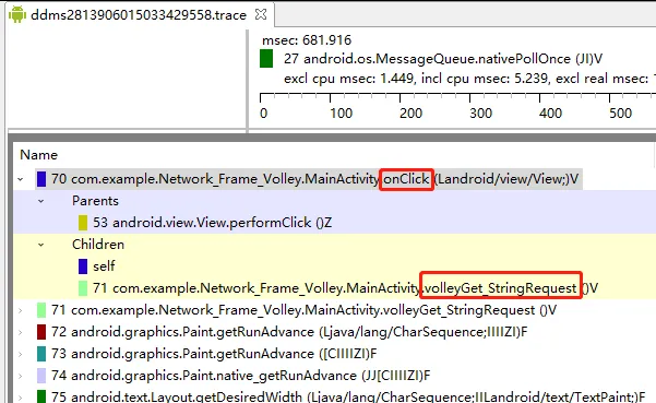 通过DDMS打开,可以看到第一个方法就是目标方法,在实际项目中,我们可以扩大startMethodTracing()、stopMethodTracing()的标注范围,从而获取标注之间的代码方法调用关系。