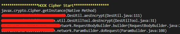 可以看到,输出的堆栈信息显示了代码经过了哪些方法最后调用到getInstance这个方法的,一眼望去,就发现了疑似我们的目标方法aesEncrypt,再经过单独hook这个方法进行确认,发现Java应用层中通信加密确实由这个方法来实现的。