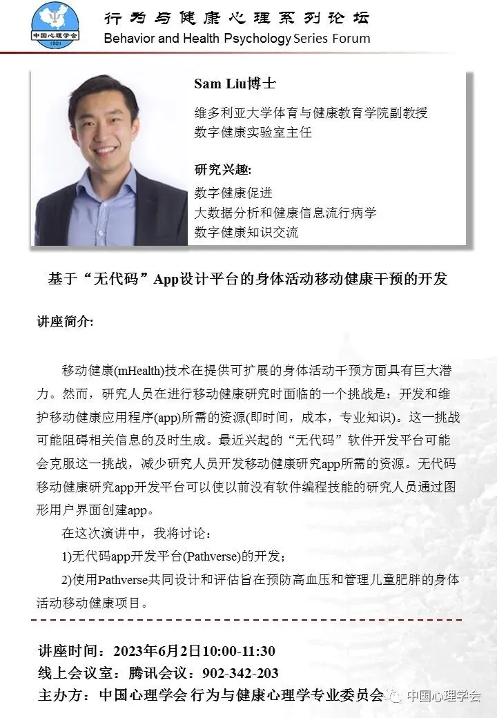 行为与健康心理系列论坛|基于“无代码”App设计平台的身体活动移动健康干预的开发