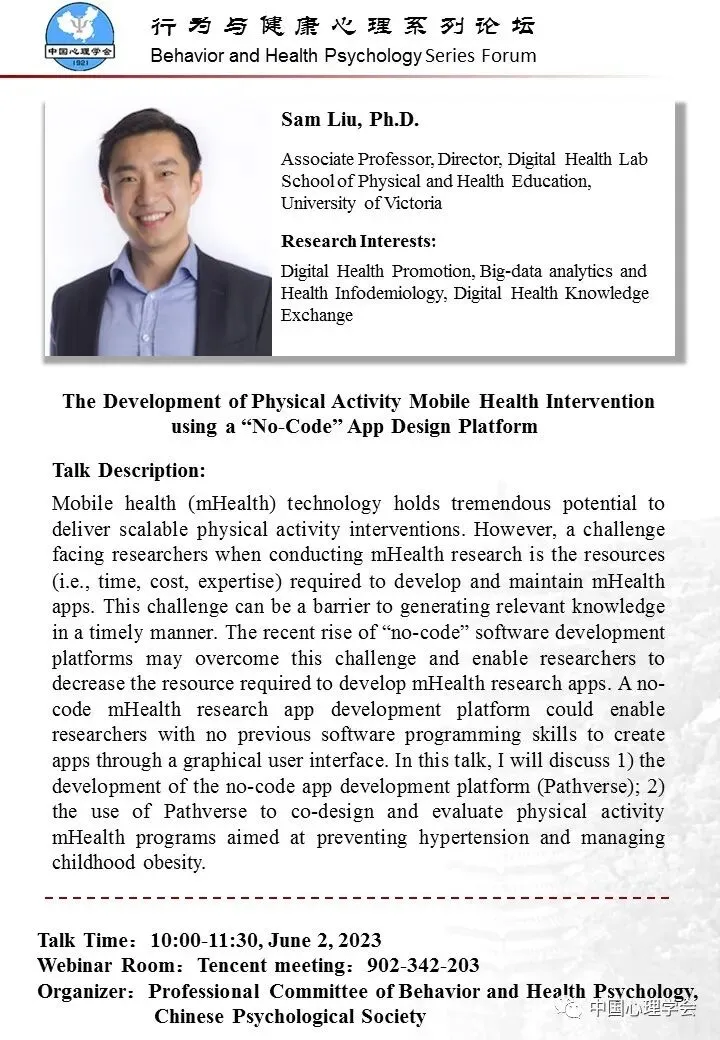 >行为与健康心理系列论坛|基于“无代码”App设计平台的身体活动移动健康干预的开发