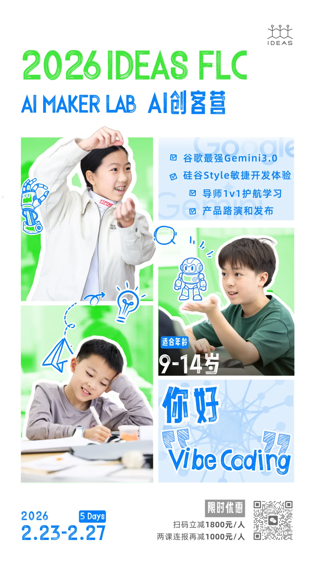 寒假,启行将接入全球领先的 Google Gemini 3.0 平台,继续为9–14岁孩子打造全新「AI创客营」— 不教语法,不背指令,而是为每个孩子配一位随叫随到的“AI技术合伙人”,用自然语言从 0 到 1 创造属于自己的App 或智能体。