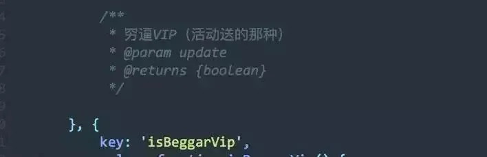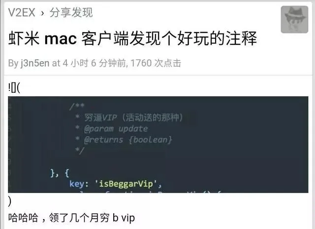 根据代码注释,“穷逼VIP”为虾米音乐通过各类活动推出优惠活动中用户领取的VIP,在写代码的时候,为了让同事看懂这串代码的作用,程序员会对这行代码进行注释。