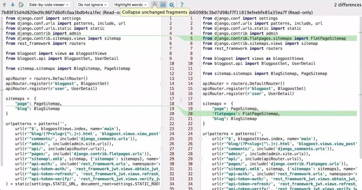 紧接着,我就可以开始去实践这个版本中的一些功能,并理解他们是怎么工作的。再用git大法展开之前修改的内容,可以使用IDE自带的Diff工具: