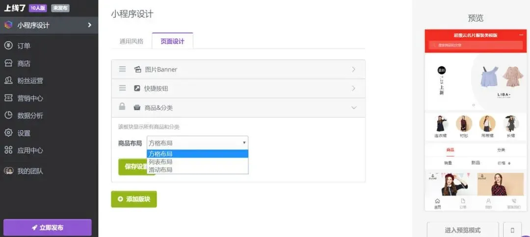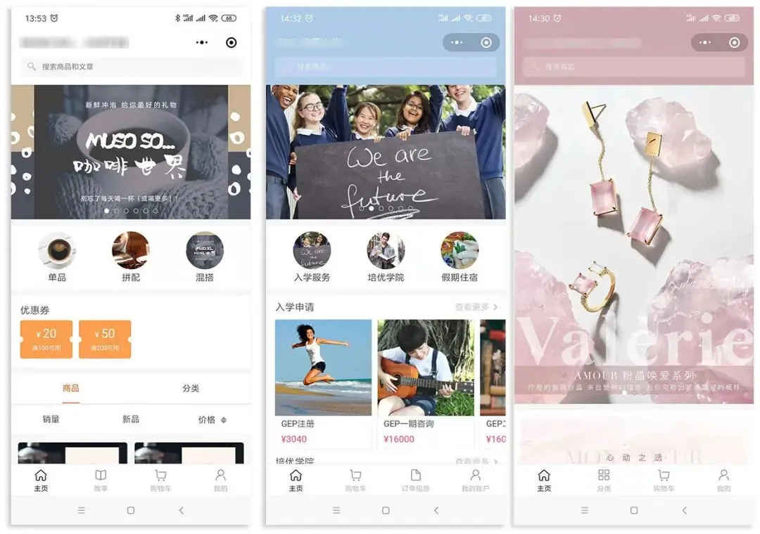 如果你是个技术小白,不懂小程序代码,那么就可以使用现成的模板来开发,现在这种方式也越来越流行了。模板该如何生成小程序呢?这个方法可比写代码简单且省事多了,你只需要找个简单的小程序制作平台,然后选个需要的模板就能快速生成小程序。以制作一个电商小程序为例,可以在「上线了」sxl.cn选择一个电商小程序模板,在后台“小程序设计”栏,可以设置小程序主题色、导航;在“页面设计”你可以添加各种版块(轮播图、拼接图、快捷按钮、视频、标题、商品列表等)。一个小程序的主页就是由各种不同版块组成的。在“商店”栏你可以添加商品,设置商品分类;在“应用中心”你可以添加近期很火的直播功能、流量主(广告位)、文章模块等。做好并预览无误后点击左下角“立即发布”,按照提示注册授权即可。小程序代码和模板开发的方式各有优劣,代码开发主要是这两个优势:开发自由度更高,类别更多,可以随心所欲地制作;