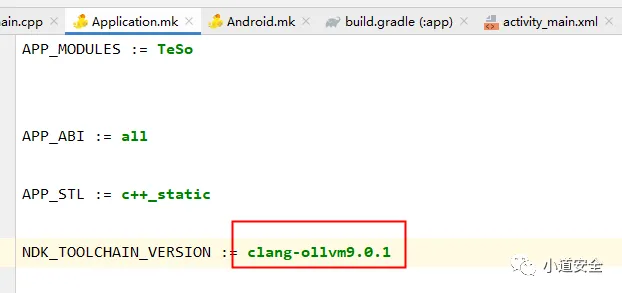通过配置Application.mk文件,进行指定ollvm的clang具体版本数据(这个具体版本数据也可以lib文件夹下clang文件夹下查看)。