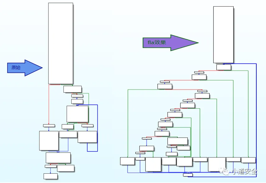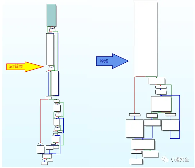 下图是基于IDA工具的原始和虚假控制流的代码保护流程图,可以看到代码的执行流程已被调整变得相对复杂化,这样就大大强化了代码的安全强度,这种逆向分析其代码至少静态分析起来就费劲了。