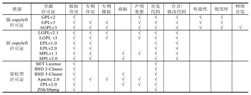 不同的开源协议规定的权利和义务也不尽相同,如在作品内附许可证原文、在头文件添加版权标识、提供源代码、标注修改的内容、授权商业使用、授权修改、授权专利许可、明确无质量担保、明确不提供商标许可等。中国信息通信研究院联合北京三快在线科技有限公司、华为软件技术有限公司、中兴通讯股份有限公司、甲骨文中国公司等公司于2020年12月发布《开源许可证兼容性指南》,在讨论开源协议之间兼容性问题的同时对部分主流协议的特征进行了比对和分析。此外,FSF官网[6]、开放源码促进会(Open Source Initiative,简称“OSI”)[7]等网站均对各主流开源协议进行了比对和综述。在实务中应该结合个案具体归纳与识别。