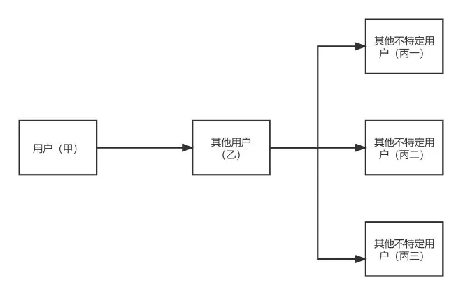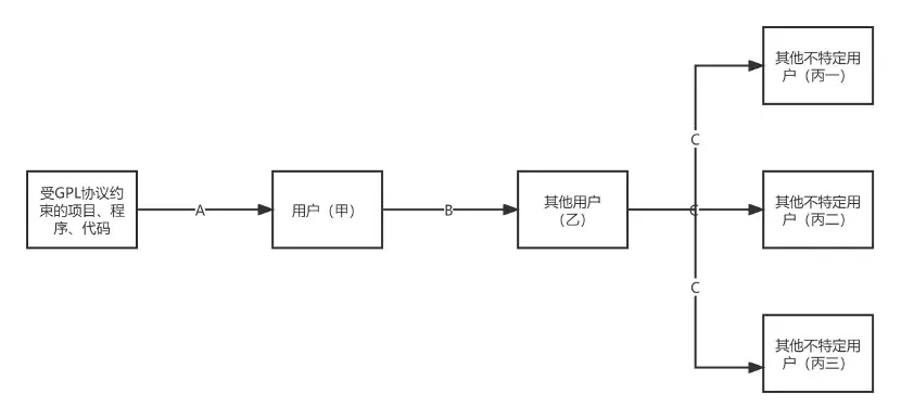 以GPL协议为例,如图一所示,我们假设用户甲从其他途径获得受GPL协议约束项目、程序、代码[5]的行为为A,用户甲依GPL协议向特定或不特定用户乙提供该作品或衍生作品的行为为B,其他用户乙向更多主体提供其从用户甲处收到作品的行为为C。按照GPL 协议的规定,即使用户甲不是该作品的著作权人,用户甲依然可以向用户乙收取费用,也可以以免费的方式向其他用户乙提供作品。GPL协议本身对过程B收费与否不做任何要求。同理,在过程C中,用户乙可以向用户丙收取费用,也可以选择以免费的方式继续传播,不受B过程的限制。