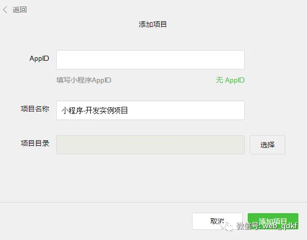 4)点击添加项目,在这一步就输入AppID,当然,你也可以选择无AppID。只是项目里有的功能会受限,项目名称可以自己定义,为了区别建议写易记易区别的名称;项目目录,这里只需要添加到app.json的上级目录即可。最后添加项目即可。