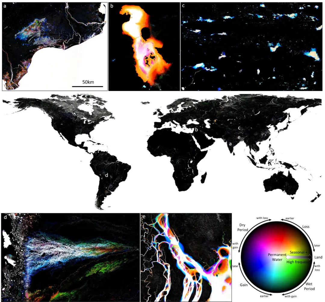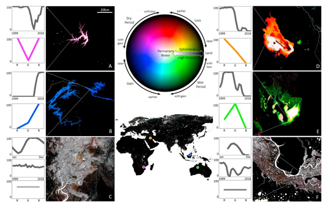 - 地图突出显示了1999年至2020年全球地表水稳定和变化动态的7种类型。