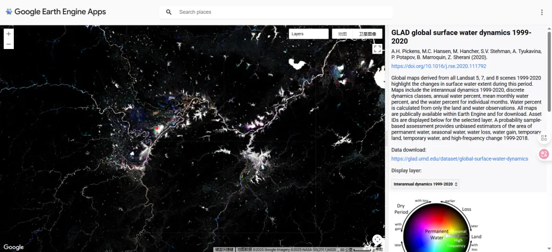 分享一个让人眼前一亮的GEE高级App(Global surface water dynamics 1999-2021),该App由马里兰大学Pickens开发。利用1999年至2018年的Landsat卫星影像时间序列,全面刻画全球内陆开放水域的动态变化,并首次采用基于概率的参考数据,无偏的补贴不确定性及标准完整。从 1999 年至 2021 年所有 Landsat 5、7 和 8 场景中获取的全球地图突出显示了这一时期地表水范围的变化,基于概率样本的评估提供了 1999 年至 2018 年永久水、季节性水、水损失、水增益、临时土地、临时水和高频变化面积的无偏估计量。