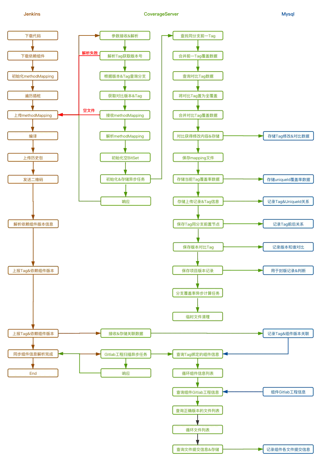 我们对 单次打包纬度、单Tag纬度、版本纬度、分支纬度 几种统计纬度进行了利弊分析&对比,最后我们选择使用分支纬度进行覆盖率数据的汇总统计,即根据Tag的前后节点关系,合并同一分支线上的所有Tag(以前一版本的发版Tag为起点,以当前分支线中最新的Tag为终点)的所有安装包的覆盖率数据。