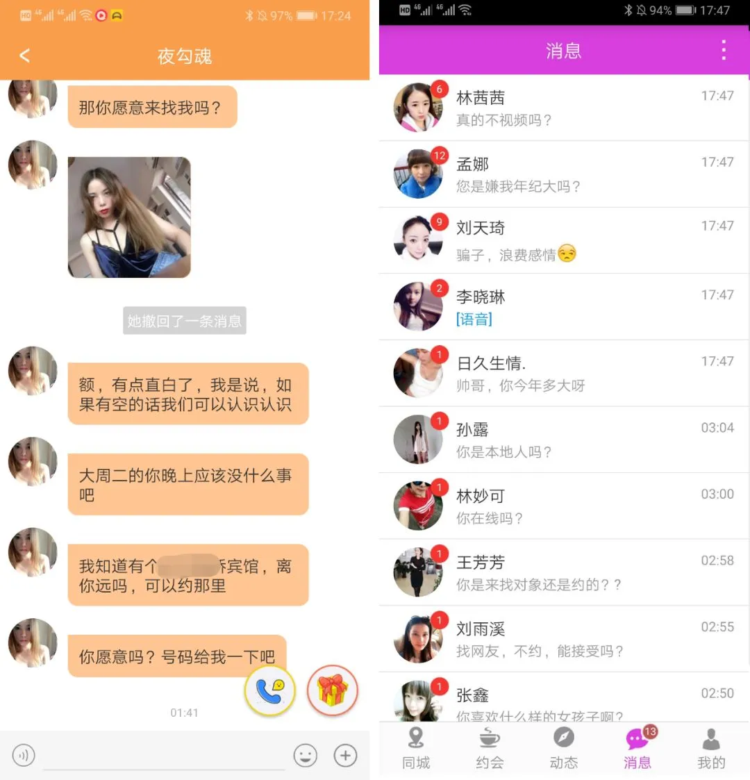 用户付费回复后,骗子就会基于GPS来给你智能发送就近的地址,造成一种女孩就在你附近的假象。用户充钱到一定程度,有了语音电话和视频聊天的需求,这个时候就会有专门的女员工陪聊。