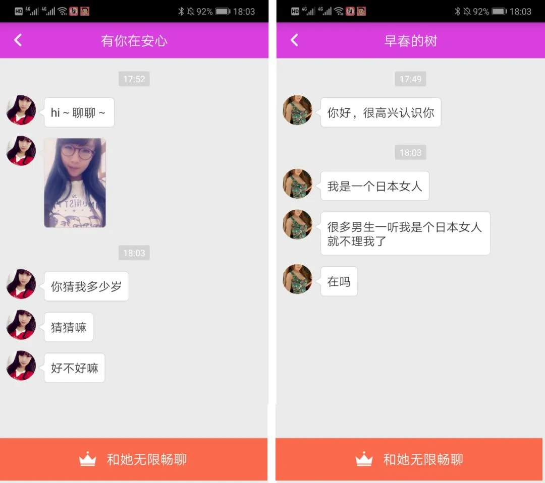 有的甚至直接发来了语音,那娇嗲嗲的声音让阿江心猿意马,恨不得马上和这些女孩见一面。但回复这些消息,先要充值69-500块的会员费,阿江充了69的会员、很快通话名额就用完了,但其他女孩还是不断发来消息。他为了能够继续聊下去,只能一步步的充值到最高的会员等级,而且通话的时候还要刷礼物给女孩子。